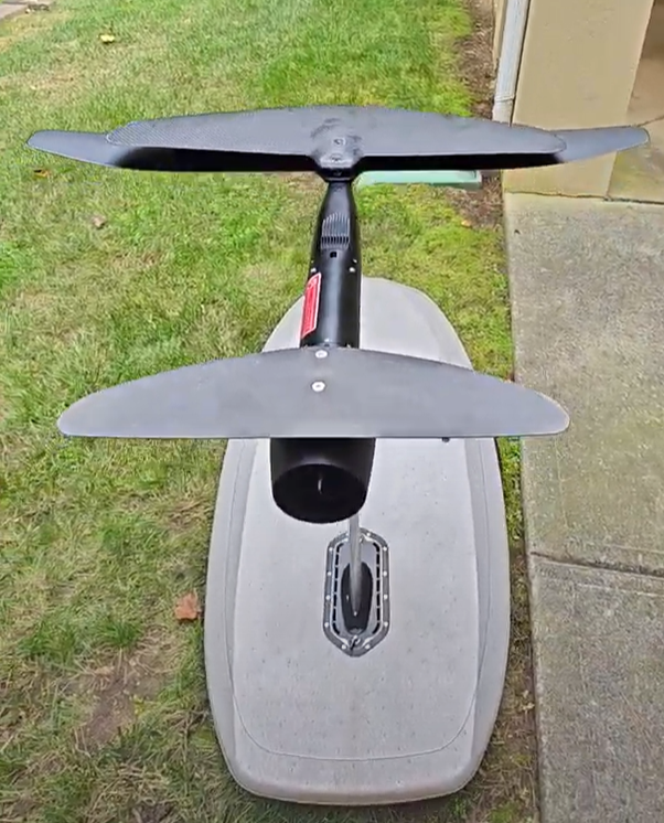 As Waydoo continues to innovate, they just released a new Glide 1500 front wing. This wing is substantially larger than the Patroller wind that came standard with my board. I have only had one test opportunity on this wing so far. I rode it with the Jet Drive and was impressed with the fact that it creates much more lift allowing me to fly at a lower gear. I believe that with this wing, the folding prop and the surf tail, I can log my longest ride ever. That would push me past the 12 mile mark on one charge. I look forward to pushing the limits with the new wing. The image is of the glide wing installed with the original patroller wing sitting on top of it. You can see how much more surface area it covers which will provide more lift and more glide.